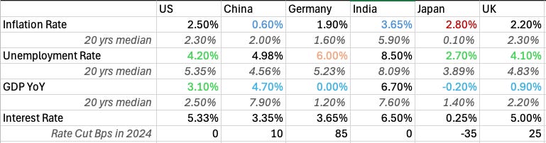 Nếu nhìn vào 6 nền kinh tế lớn nhất trên thế giới thì phần lớn các nước đều đang có tỉ lệ lạm phát khá thấp, tốc độ tăng trưởng GDP thấp hơn trung vị 20 năm, các nước như Đức, Nhật, Anh thậm chí là gần bằng 0 hoặc âm mặc cho tỉ lệ thất nghiệp đang không quá cao.