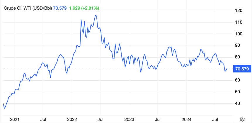 Sự suy giảm của nền kinh tế thế giới còn thể hiện qua giá dầu, khi mà nhu cầu về năng lượng giảm đi đáng kể dù cho đang có chiến tranh, khiến giá dầu giảm về mức khá thấp trong 2 năm qua.